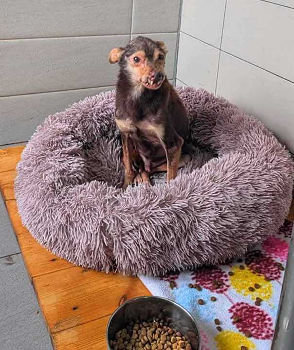 Fredi im Tierheim – zusammen mit fast 400 Hunden. Sein Alltag ist laut, die Kälte kriecht in seinen kleinen Körper, und er friert schnell. Zusätzlich hat er eine deutliche Fehlstellung der Zähne; zum Glück kann er trotzdem gut fressen.
