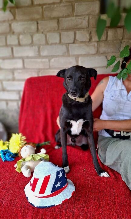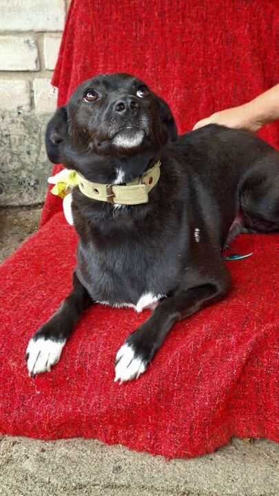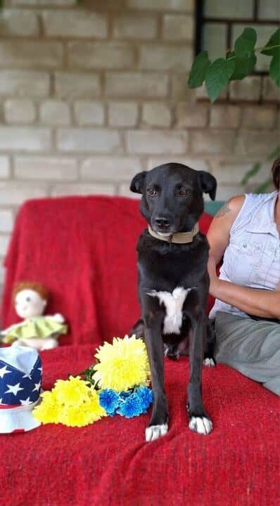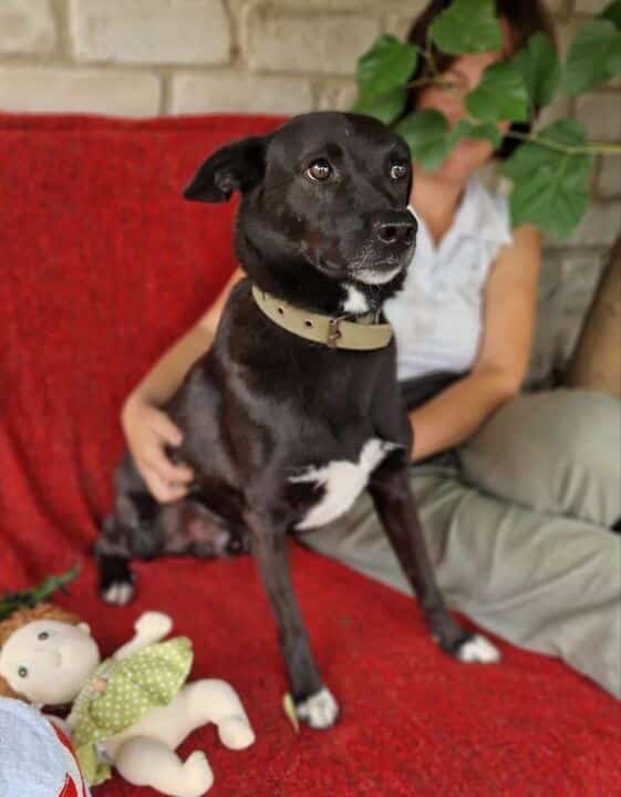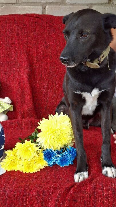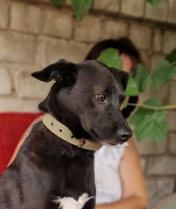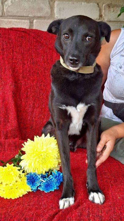 ist ein etwa zweijähriger Rüde, dessen Geschichte tief berührt. Noch immer lebt er im Kriegsgebiet von Cherson, in einem kleinen, provisorischen Tierheim, das immer wieder unter der ständigen Gefahr von Angriffen steht. Jeder Tag dort ist ungewiss, jeder Moment ein Kampf ums Überleben.
