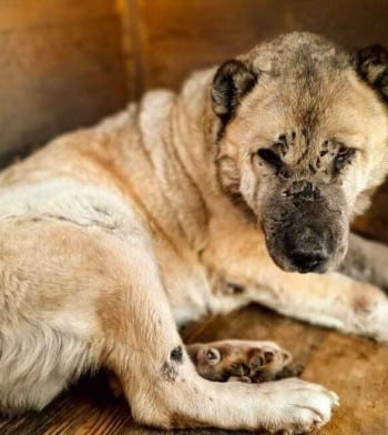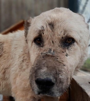 Saguramo trug ein Gesicht voller Narben. Vermutlich wurde er für Kämpfe missbraucht – und als er nicht mehr „nützlich“ war, ließ man ihn bei Müllcontainern liegen. Das Tierheim nahm ihn auf. Tierärzte bestätigten: Saguramo war blind.